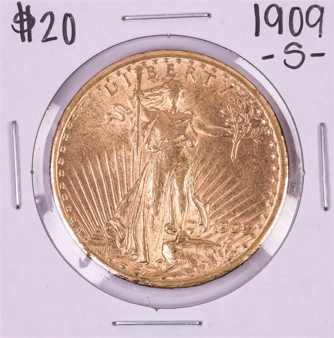 One 1909-S $20 St. Gaudens Double Eagle Gold Coin.