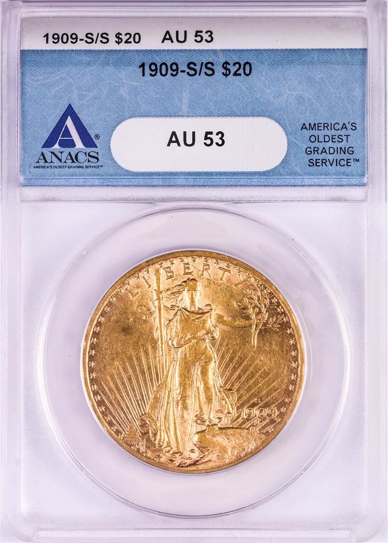 One 1909-S/S $20 St. Gaudens Double Eagle Gold Coin ANACS AU53. ANACS Certified.
