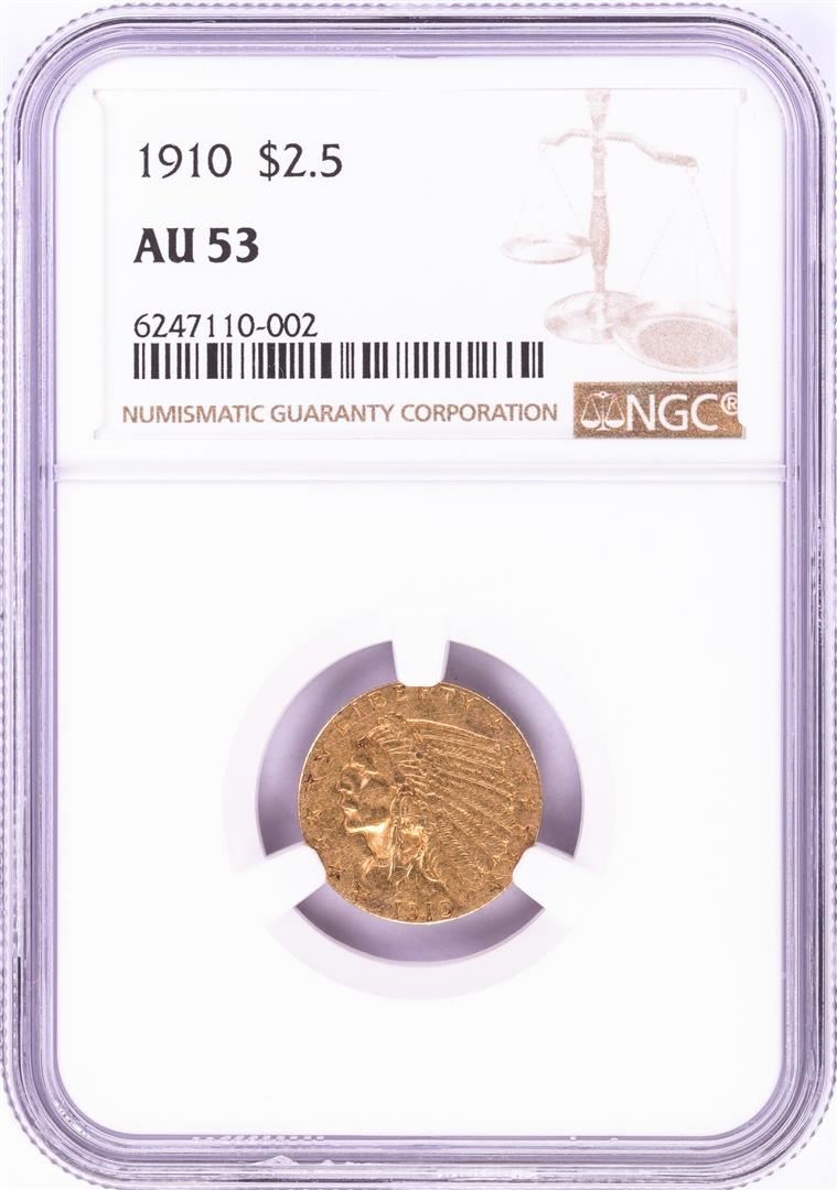 One 1910 $2 1/2 Indian Head Quarter Eagle Gold Coin NGC AU53. NGC Certified.