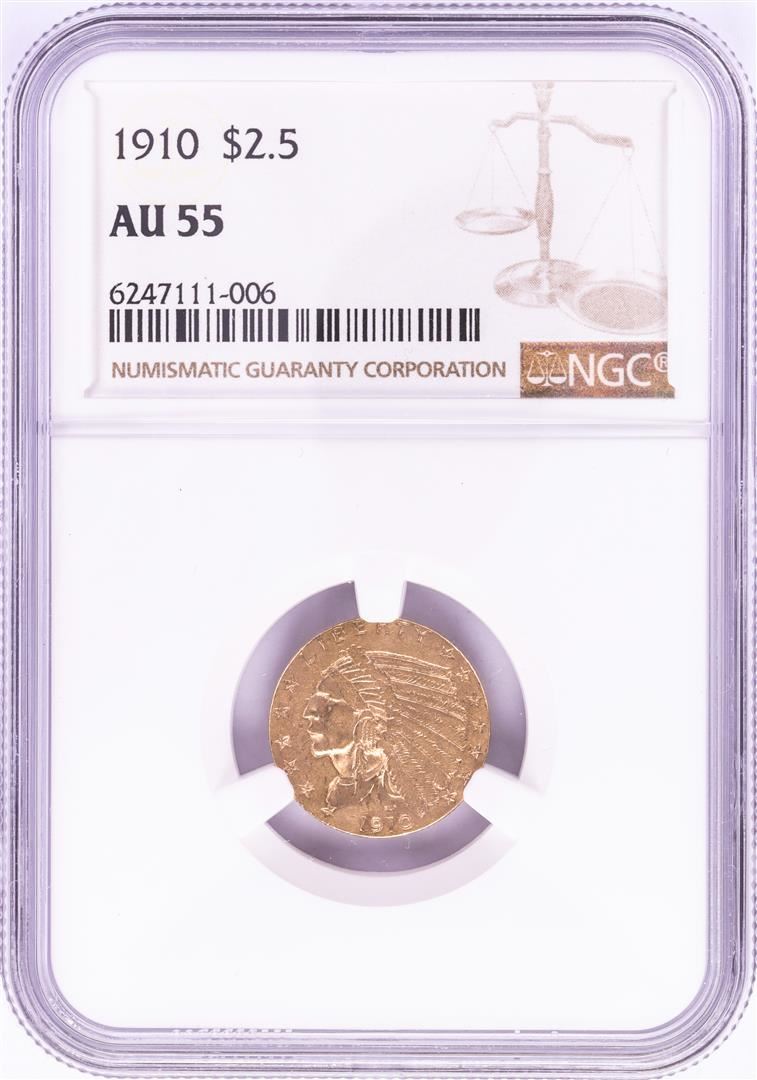 One 1910 $2 1/2 Indian Head Quarter Eagle Gold Coin NGC AU55. NGC Certified.
