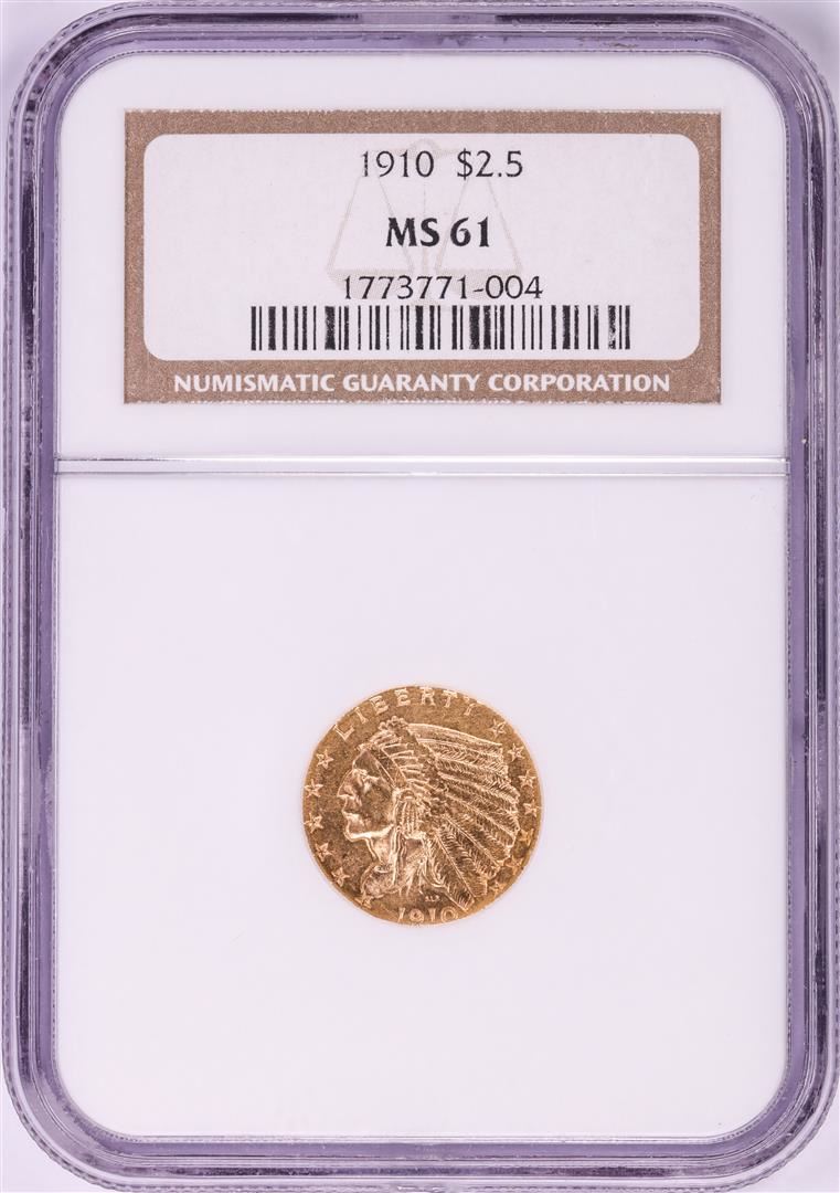 One 1910 $2 1/2 Indian Head Quarter Eagle Gold Coin NGC MS61.