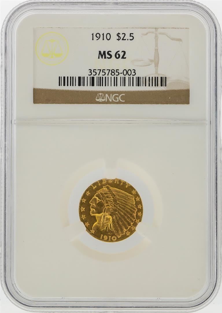 One 1910 $2 1/2 Indian Head Quarter Eagle Gold Coin NGC MS62. NGC Certified.