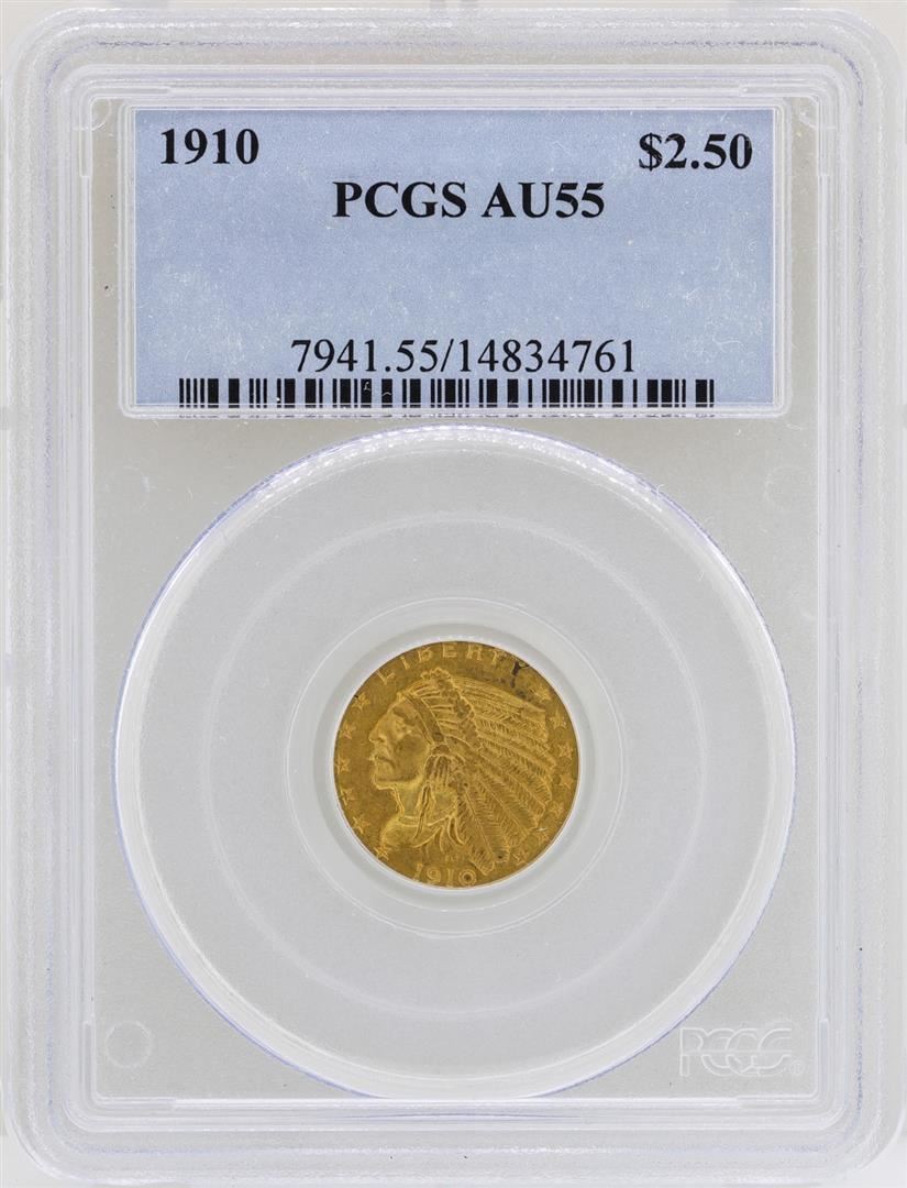 One 1910 $2 1/2 Indian Head Quarter Eagle Gold Coin PCGS AU55. PCGS Graded.