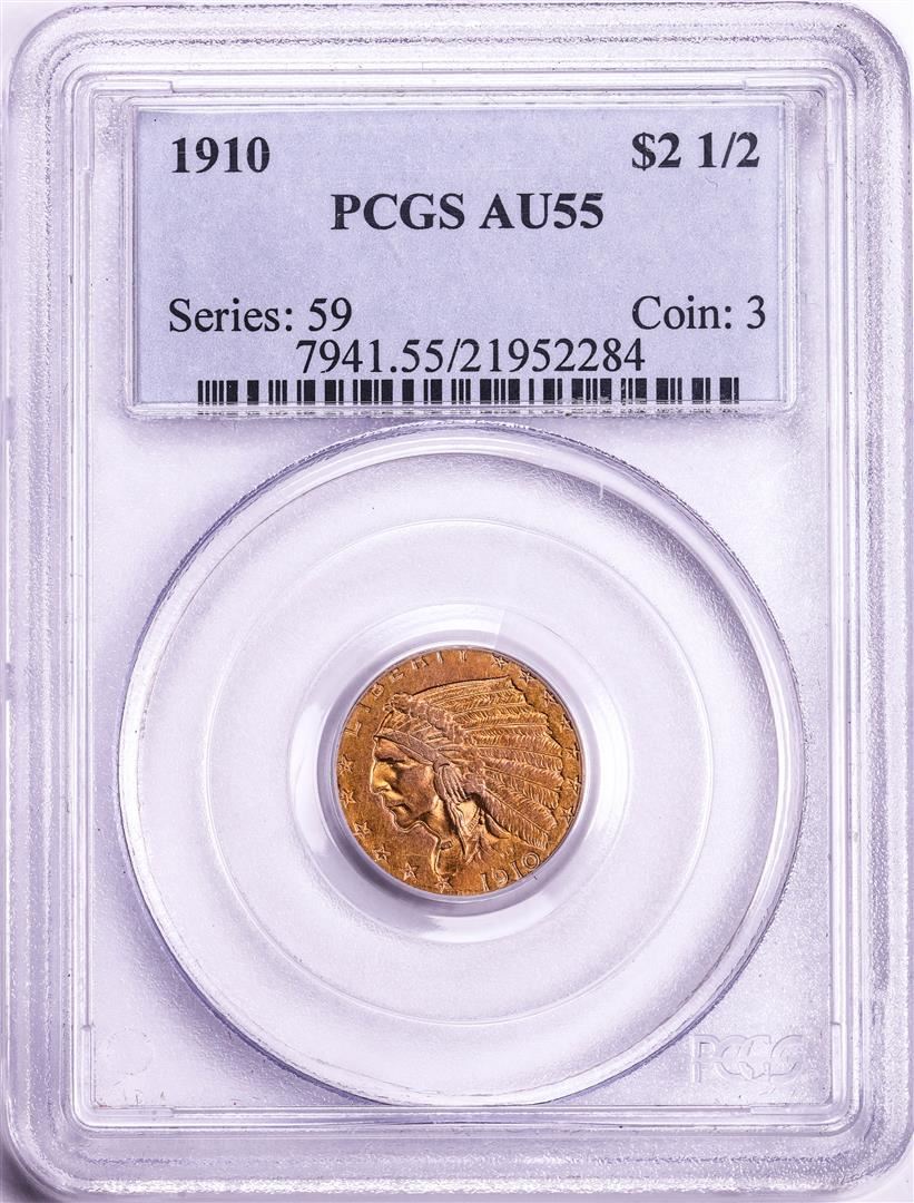 One 1910 $2 1/2 Indian Head Quarter Eagle Gold Coin PCGS AU55. PCGS Graded.