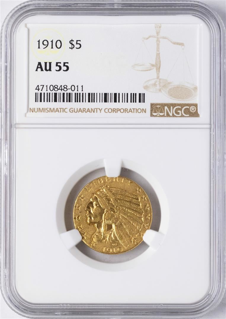 One 1910 $5 Indian Head Half Eagle Gold Coin NGC AU55. NGC Certified.