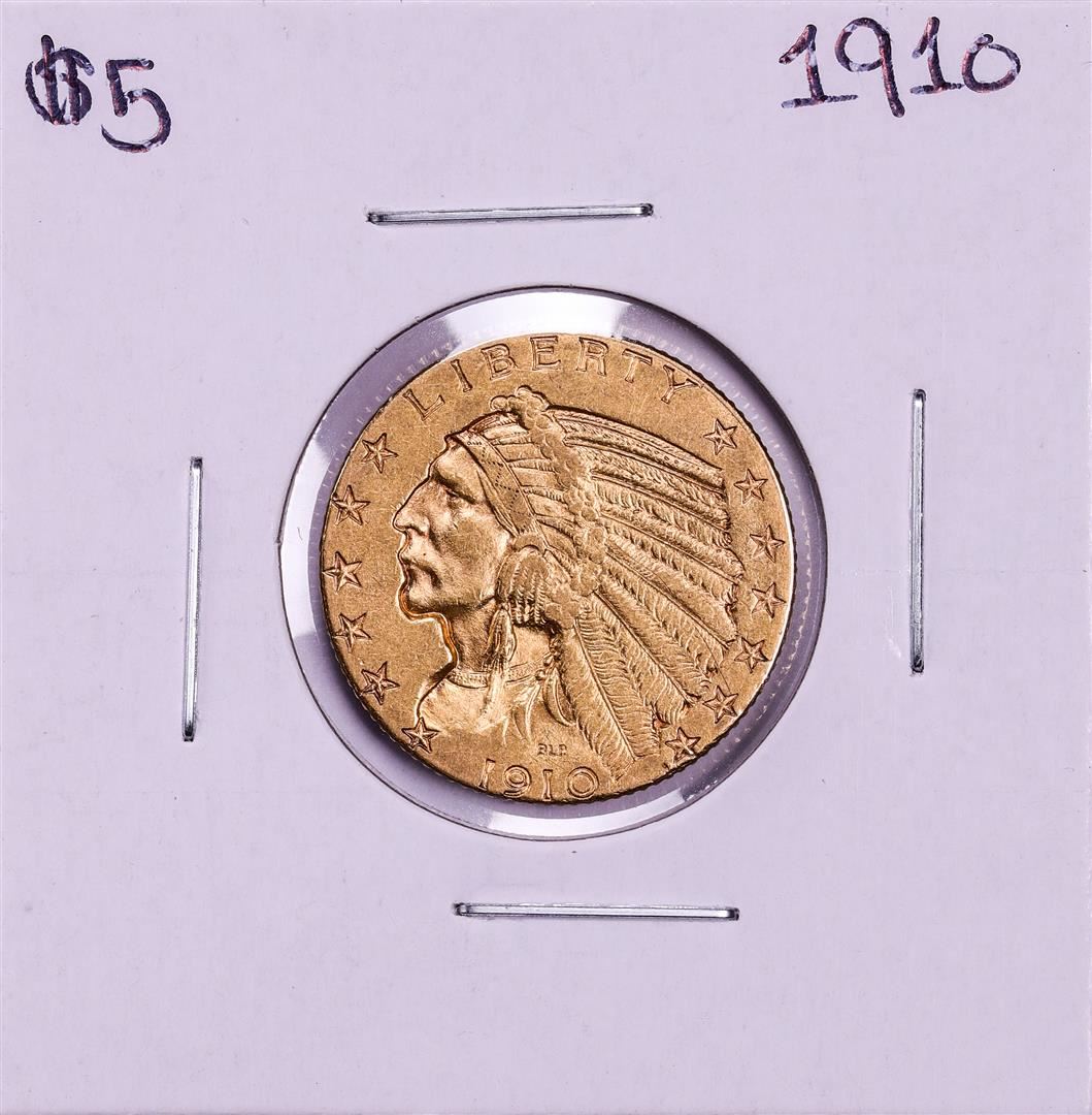 One 1910 $5 Indian Head Half Eagle Gold Coin.