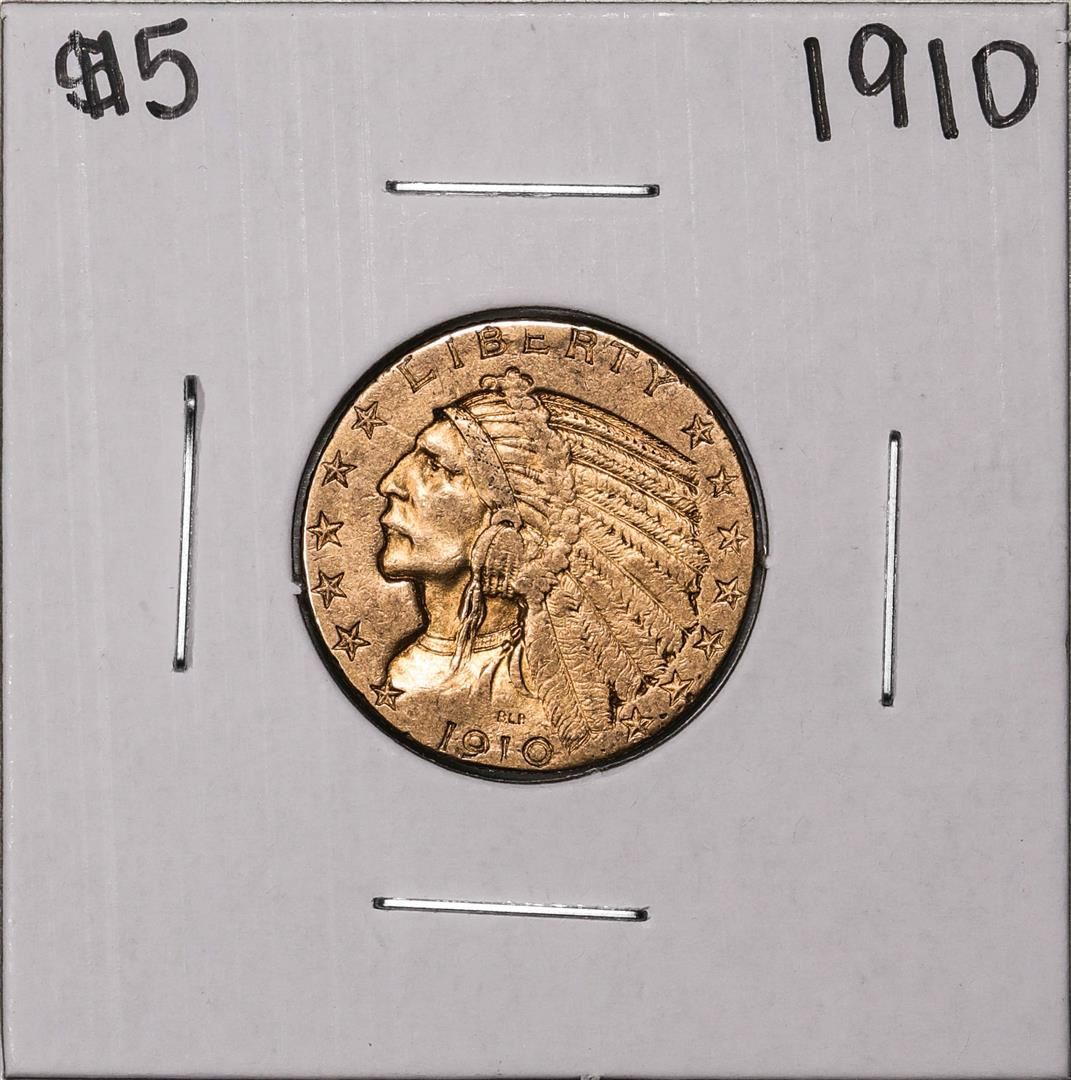 One 1910 $5 Indian Head Half Eagle Gold Coin.