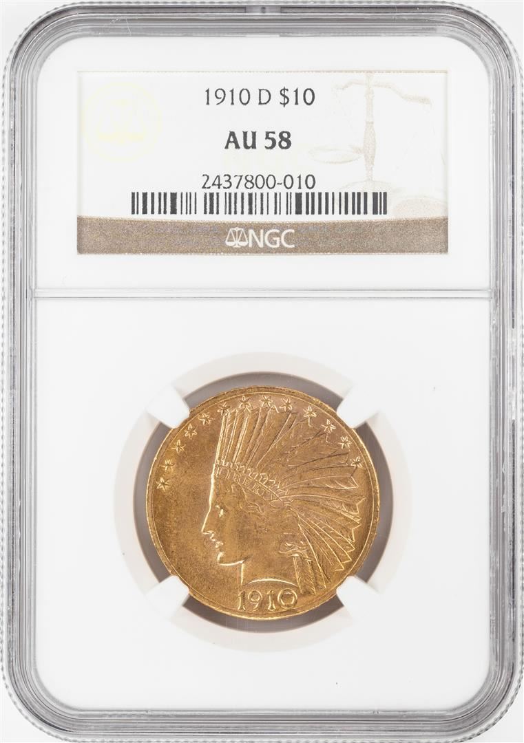 One 1910-D $10 Indian Head Eagle Gold Coin NGC AU58. NGC Certified.