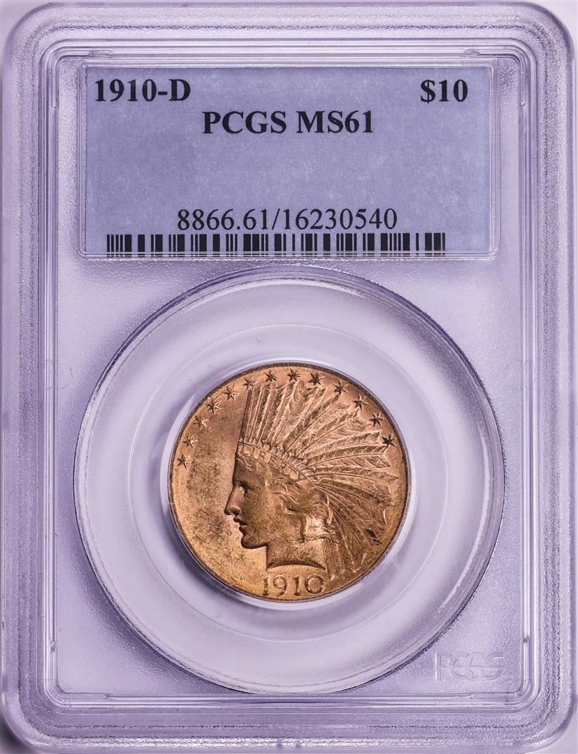 One 1910-D $10 Indian Head Eagle Gold Coin PCGS MS61. PCGS Graded.