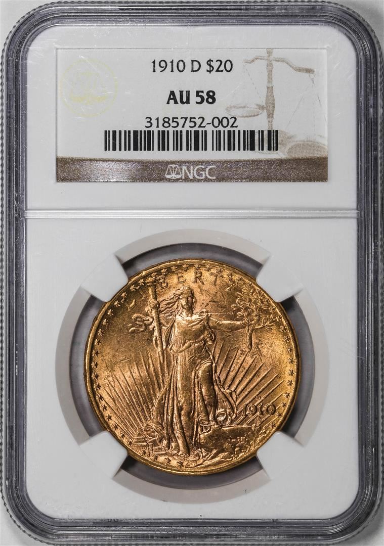 One 1910-D $20 St. Gaudens Double Eagle Gold Coin NGC AU58. NGC Certified.