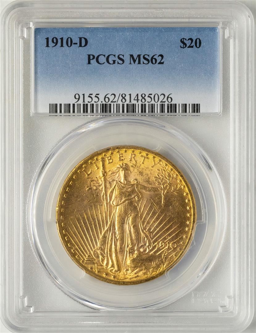 One 1910-D $20 St. Gaudens Double Eagle Gold Coin PCGS MS62. PCGS Graded.