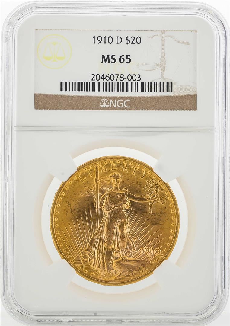 One 1910-D $20 St. Gaudens Double Eagle Gold Coin PCGS MS65. PCGS Graded.