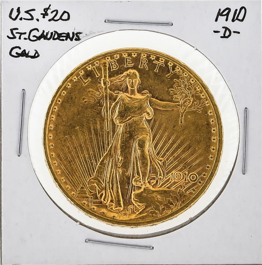 One 1910-D $20 St. Gaudens Double Eagle Gold Coin.