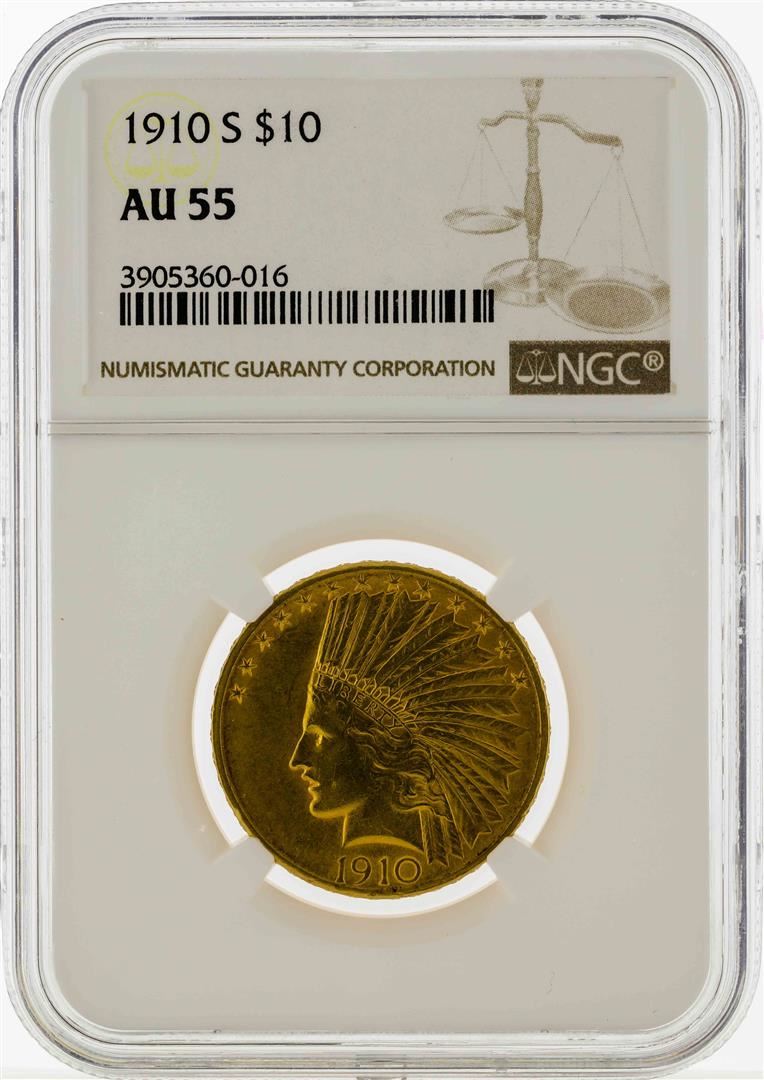 One 1910-S $10 Indian Head Eagle Gold Coin NGC AU55. NGC Certified.