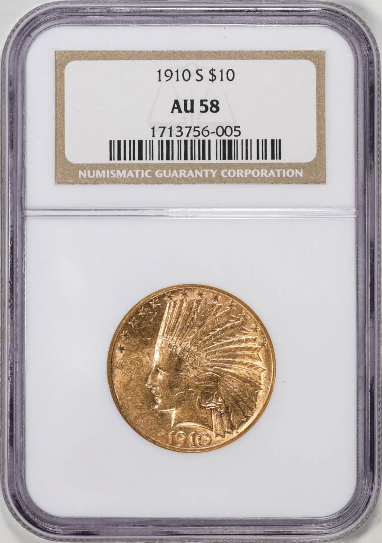 One 1910-S $10 Indian Head Eagle Gold Coin NGC AU58. NGC Certified.