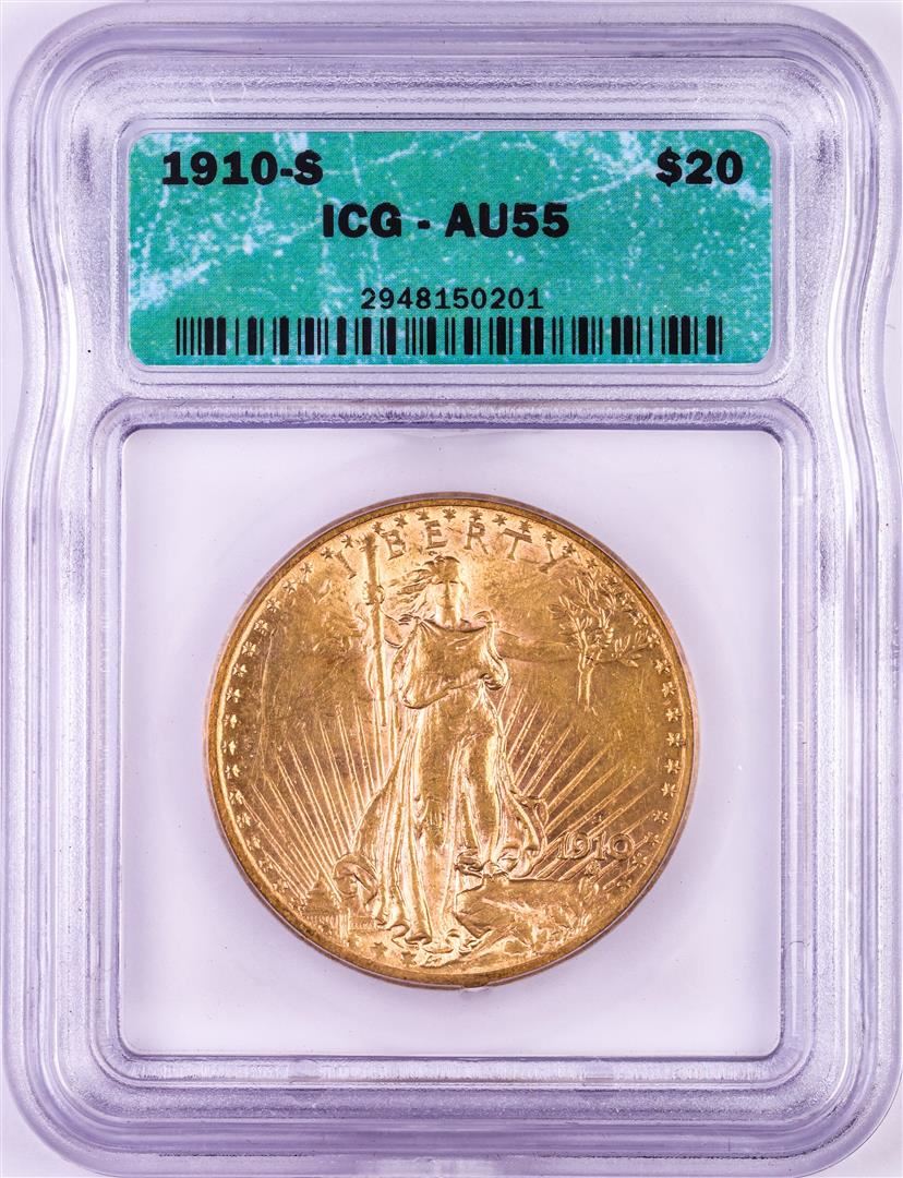 One 1910-S $20 St. Gaudens Double Eagle Gold Coin ICG AU55. ICG Certified.