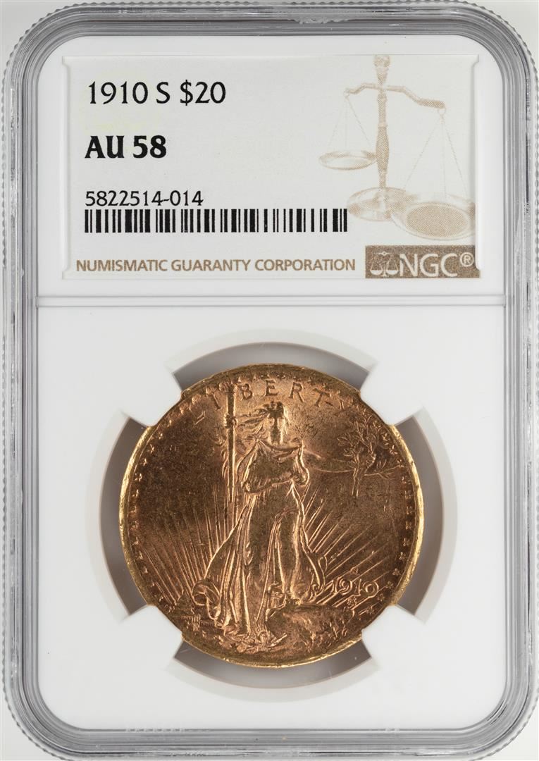 One 1910-S $20 St. Gaudens Double Eagle Gold Coin NGC AU58. NGC Certified.
