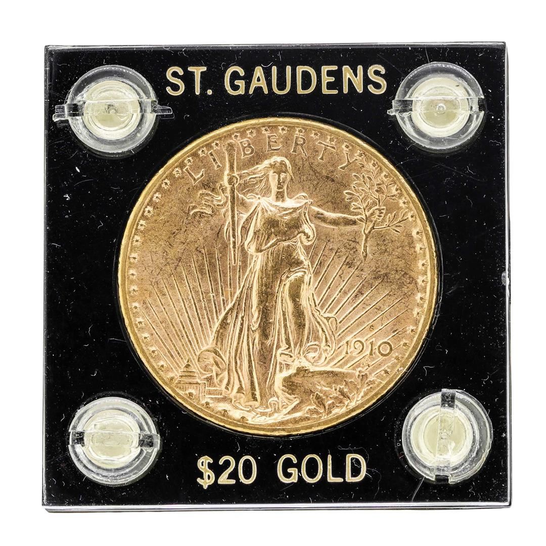 One 1910-S $20 St. Gaudens Double Eagle Gold Coin.