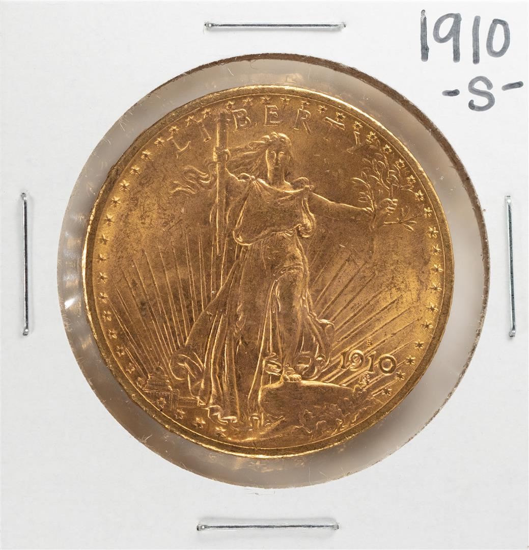 One 1910-S $20 St. Gaudens Double Eagle Gold Coin.