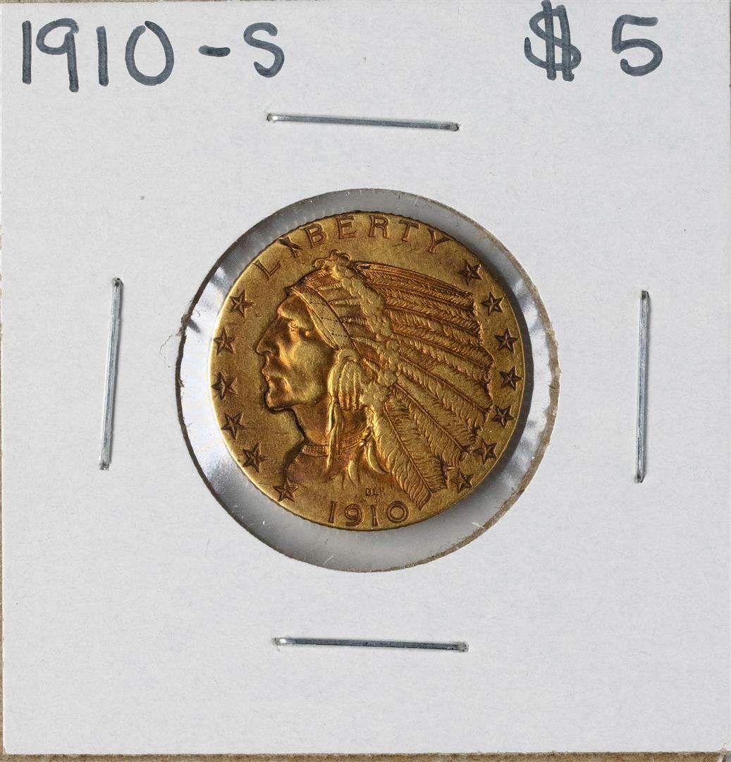 One 1910-S $5 Indian Head Half Eagle Gold Coin.