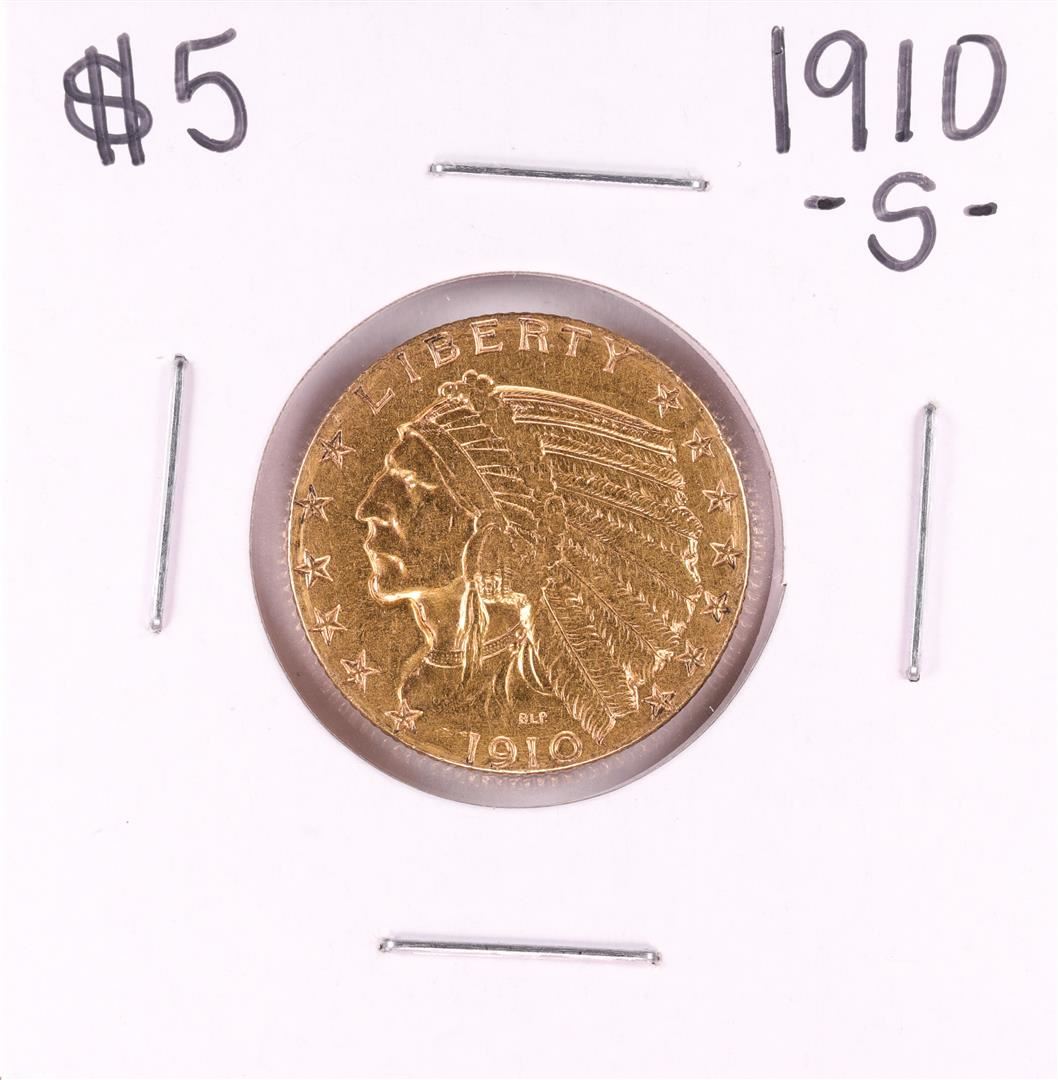 One 1910-S $5 Indian Head Half Eagle Gold Coin.