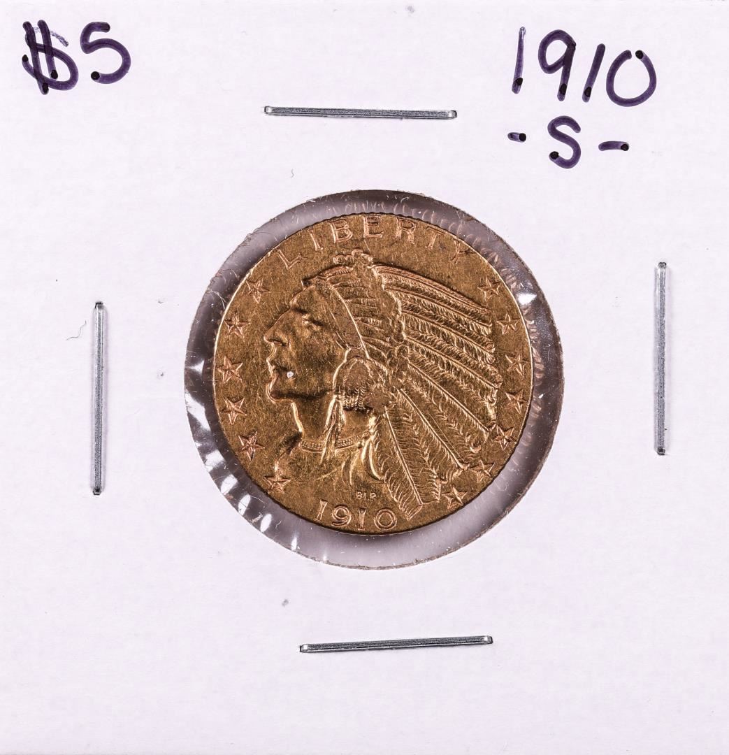 One 1910-S $5 Indian Head Half Eagle Gold Coin.