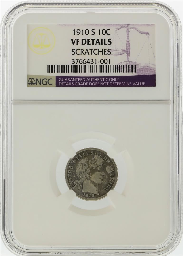 One 1910-S Liberty Head Dime NGC Graded VF Details Scratches. NGC Certified.