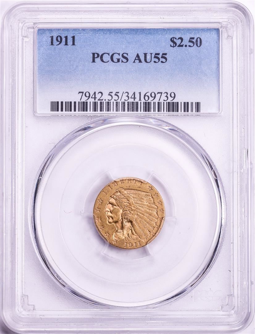 One 1911 $2 1/2 Indian Head Quarter Eagle Gold Coin PCGS AU55. PCGS Graded.