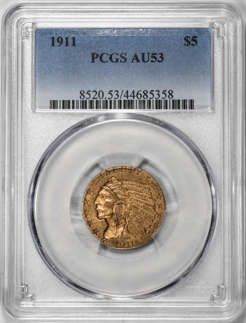 One 1911 $5 Indian Head Half Eagle Coin PCGS AU53. PCGS Graded.