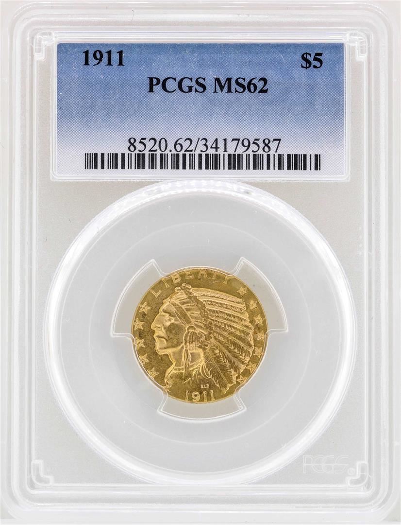 One 1911 $5 Indian Head Half Eagle Gold Coin PCGS MS62. PCGS Graded.