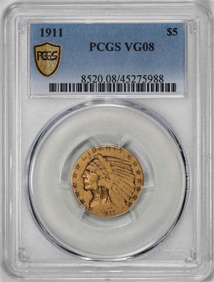 One 1911 $5 Indian Head Half Eagle Gold Coin PCGS VG08. PCGS Graded.