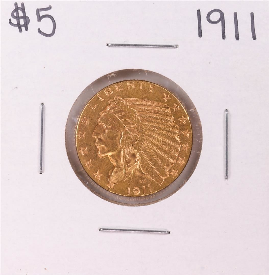 One 1911 $5 Indian Head Half Eagle Gold Coin.