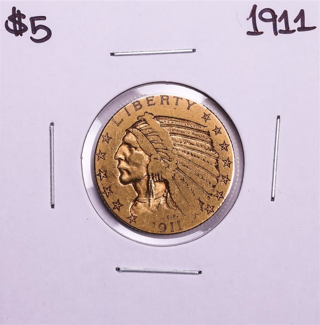 One 1911 $5 Indian Head Half Eagle Gold Coin.