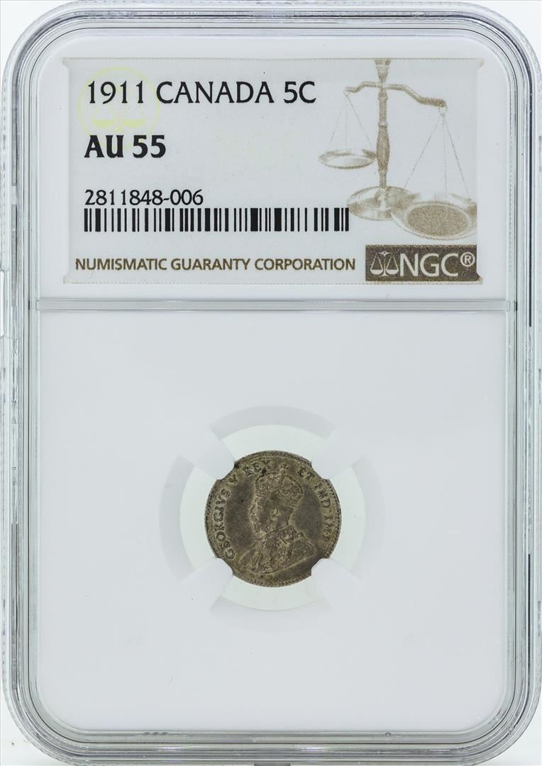 One 1911 Canada 5 Cent Coin NGC AU55. NGC Certified.