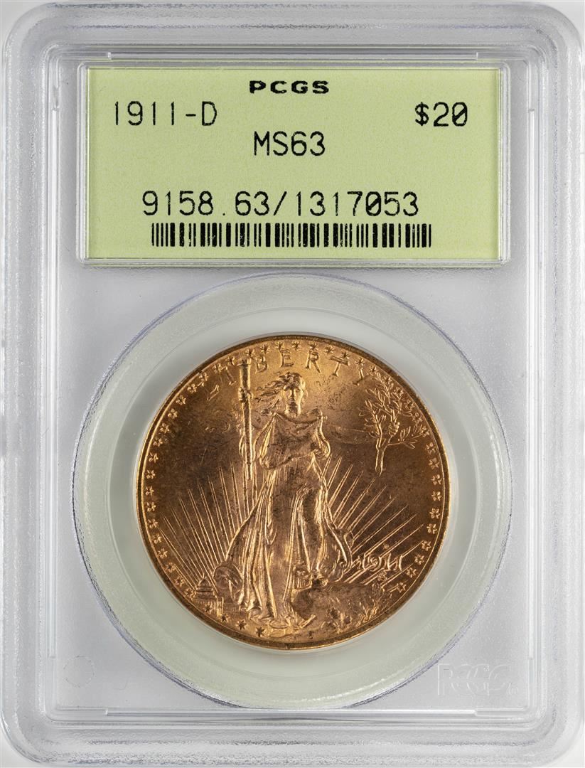 One 1911-D $20 St. Gaudens Double Eagle Gold Coin PCGS MS63 OGH. PCGS Graded.