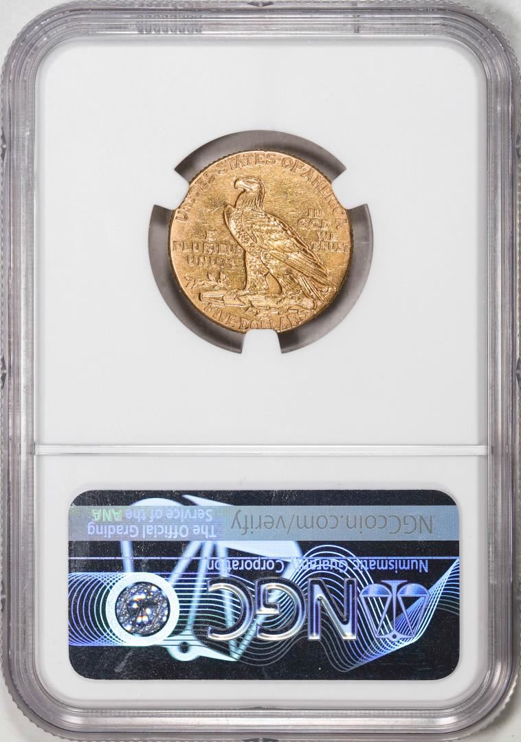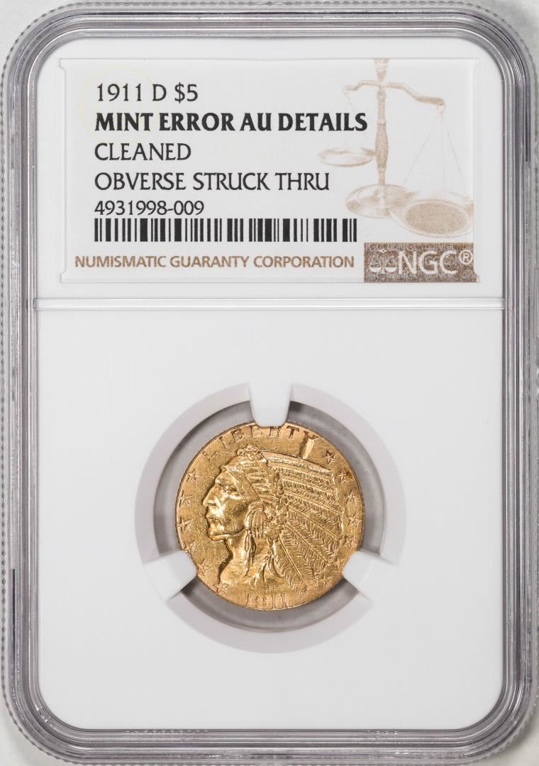 One 1911-D $5 Indian Head Half Eagle Gold Coin Obverse Struck Thru Error NGC AU Details. NGC Certified.