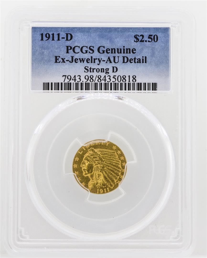 One 1911-D Strong D $2 1/2 Indian Head Quarter Eagle Gold Coin PCGS AU Details. PCGS Graded.