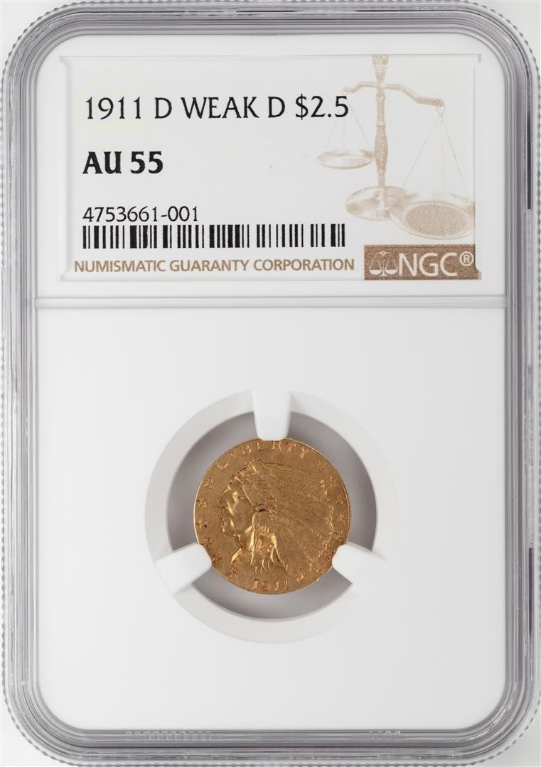One 1911-D Weak D $2 1/2 Indian Head Quarter Eagle Gold Coin NGC AU55. NGC Certified.