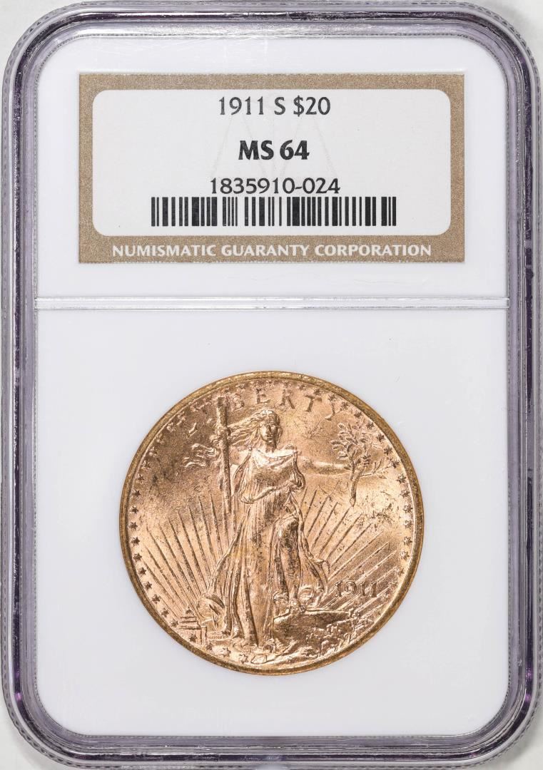 One 1911-S $20 St. Gaudens Double Eagle Gold Coin NGC MS64. NGC Certified.