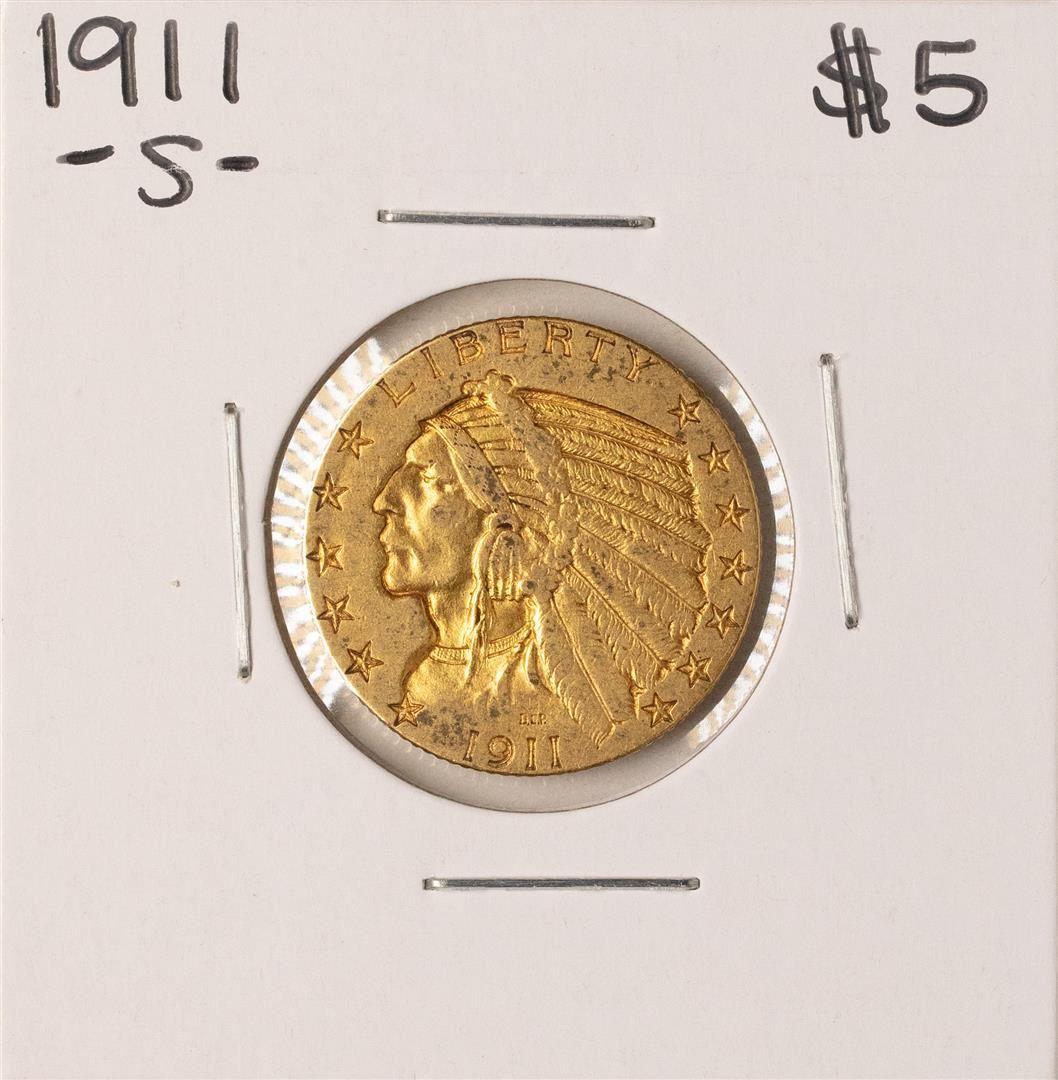 One 1911-S $5 Indian Head Half Eagle Gold Coin.