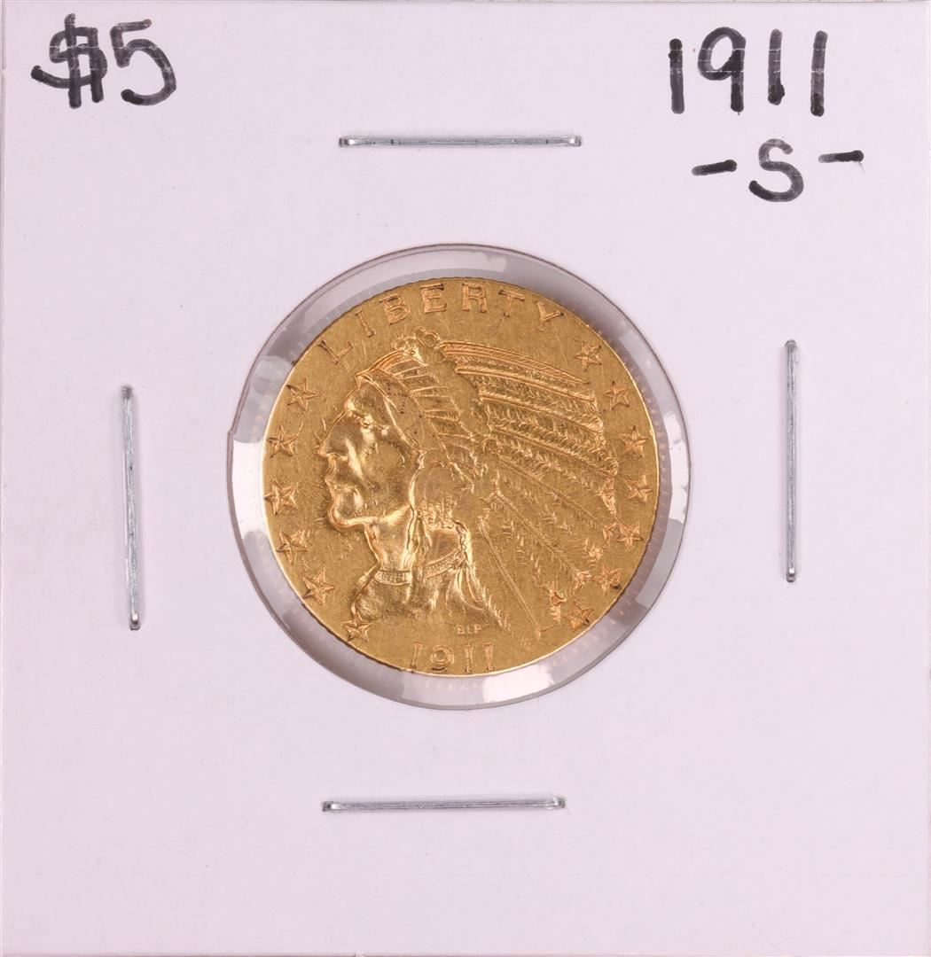 One 1911-S $5 Indian Head Half Eagle Gold Coin.