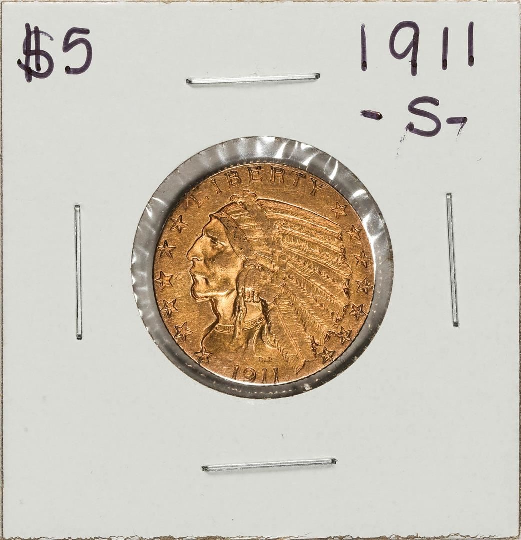 One 1911-S $5 Indian Head Half Eagle Gold Coin.