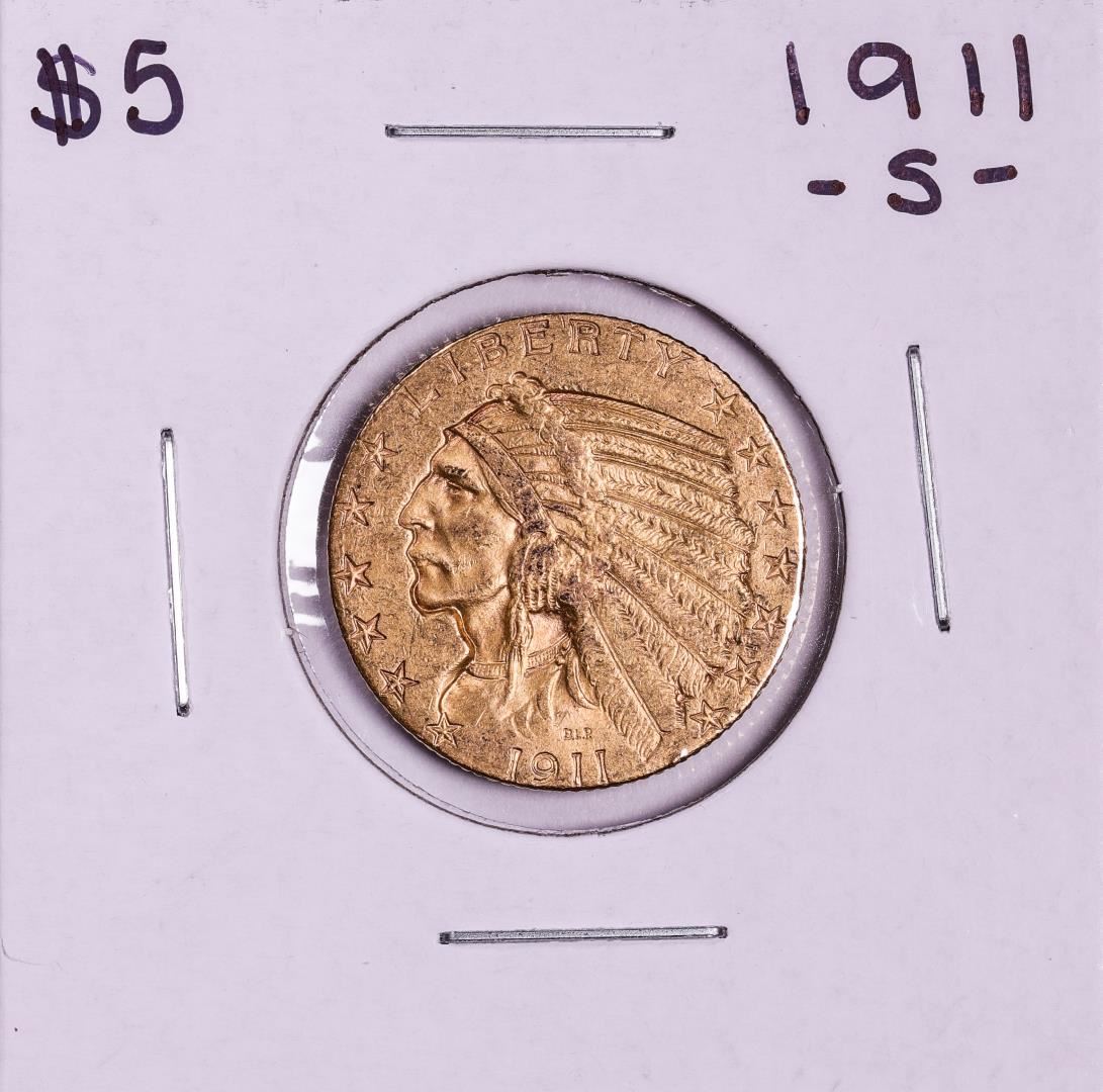 One 1911-S $5 Indian Head Half Eagle Gold Coin.