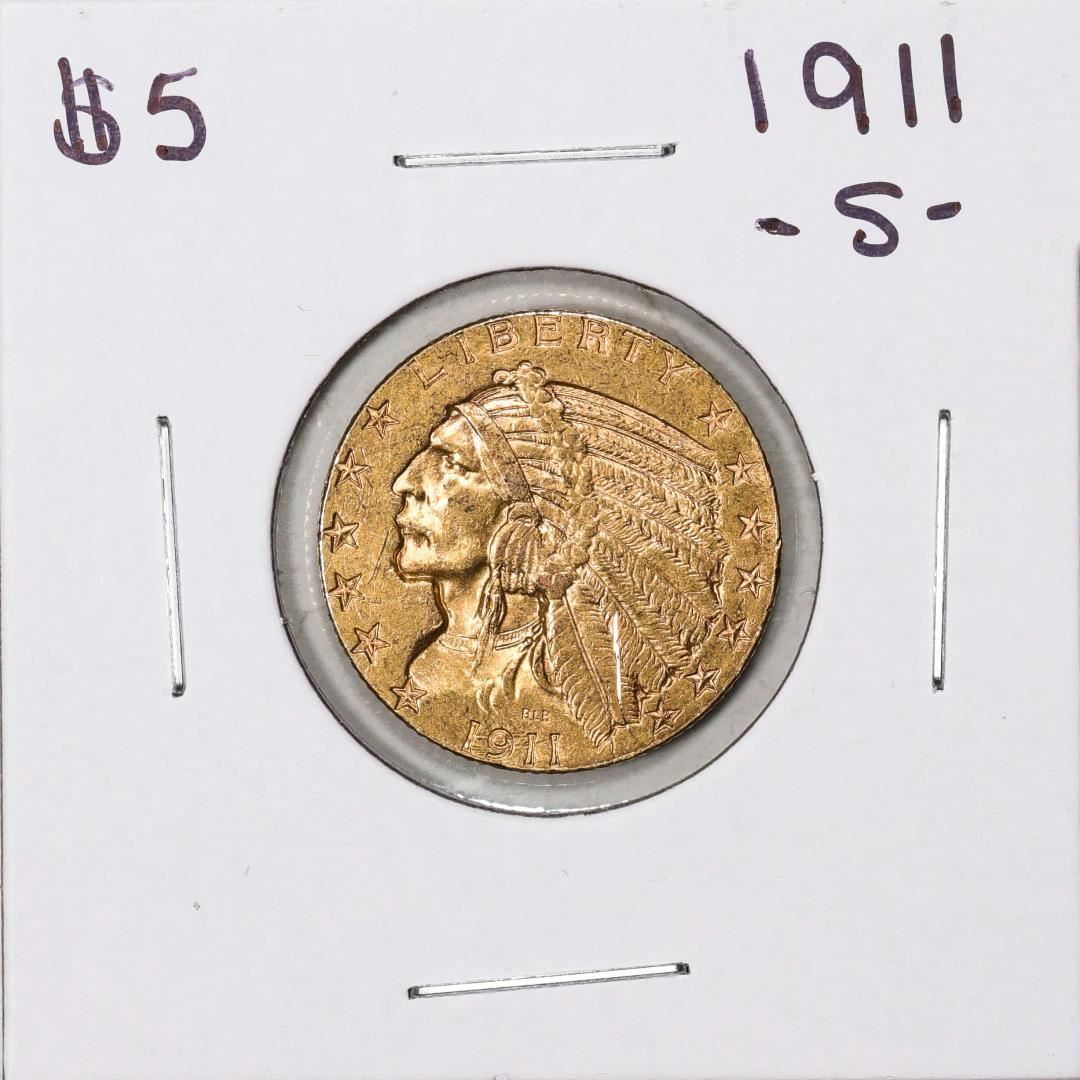 One 1911-S $5 Indian Head Half Eagle Gold Coin.