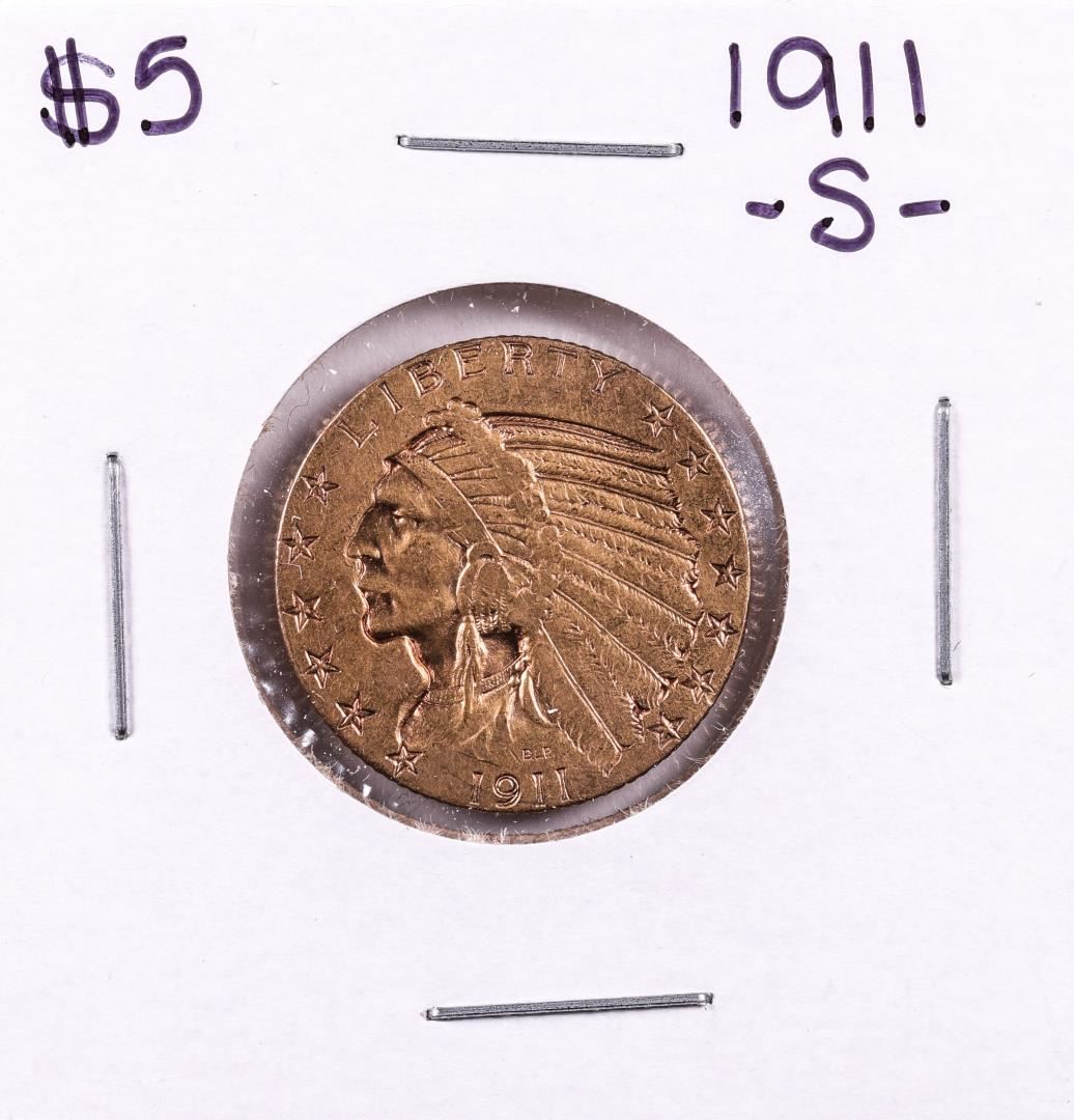 One 1911-S $5 Indian Head Half Eagle Gold Coin.