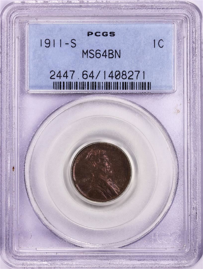 One 1911-S Lincoln Wheat Cent Coin PCGS MS64BN. PCGS Graded.