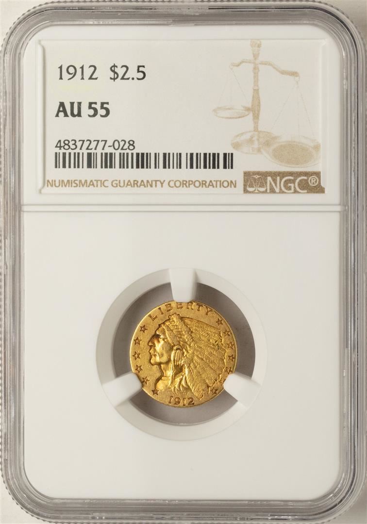 One 1912 $2 1/2 Indian Head Quarter Eagle Gold Coin AU55.