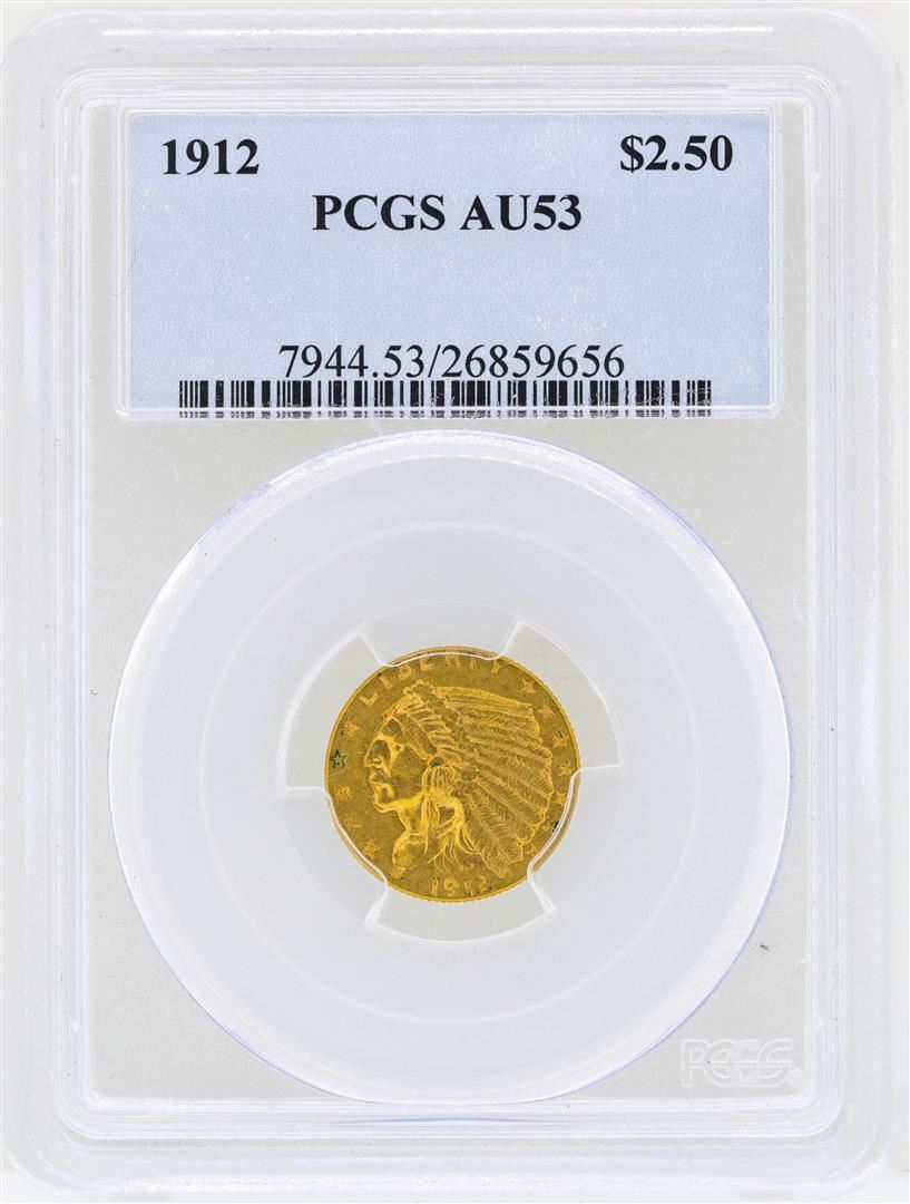 One 1912 $2 1/2 Indian Head Quarter Eagle Gold Coin PCGS AU53. PCGS Graded.