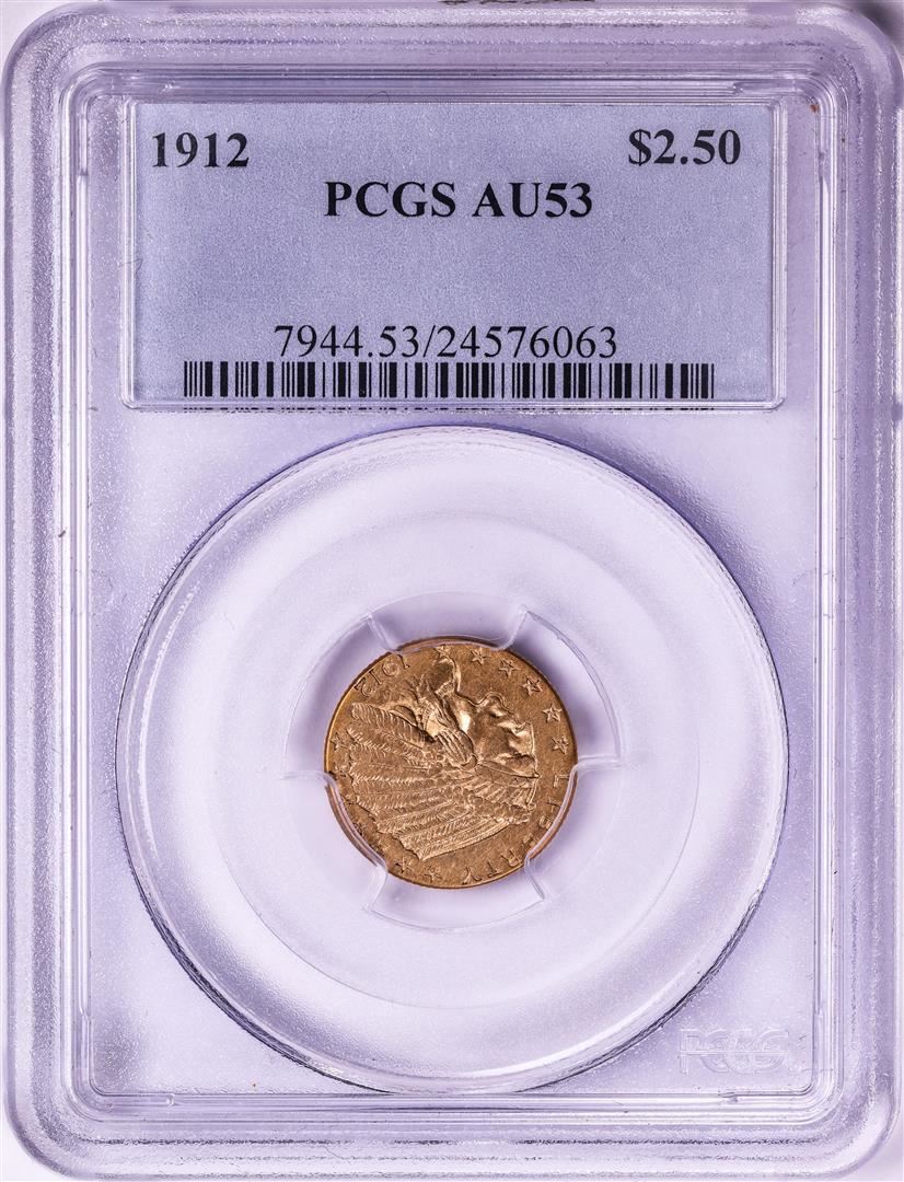 One 1912 $2 1/2 Indian Head Quarter Eagle Gold Coin PCGS AU53. PCGS Graded.