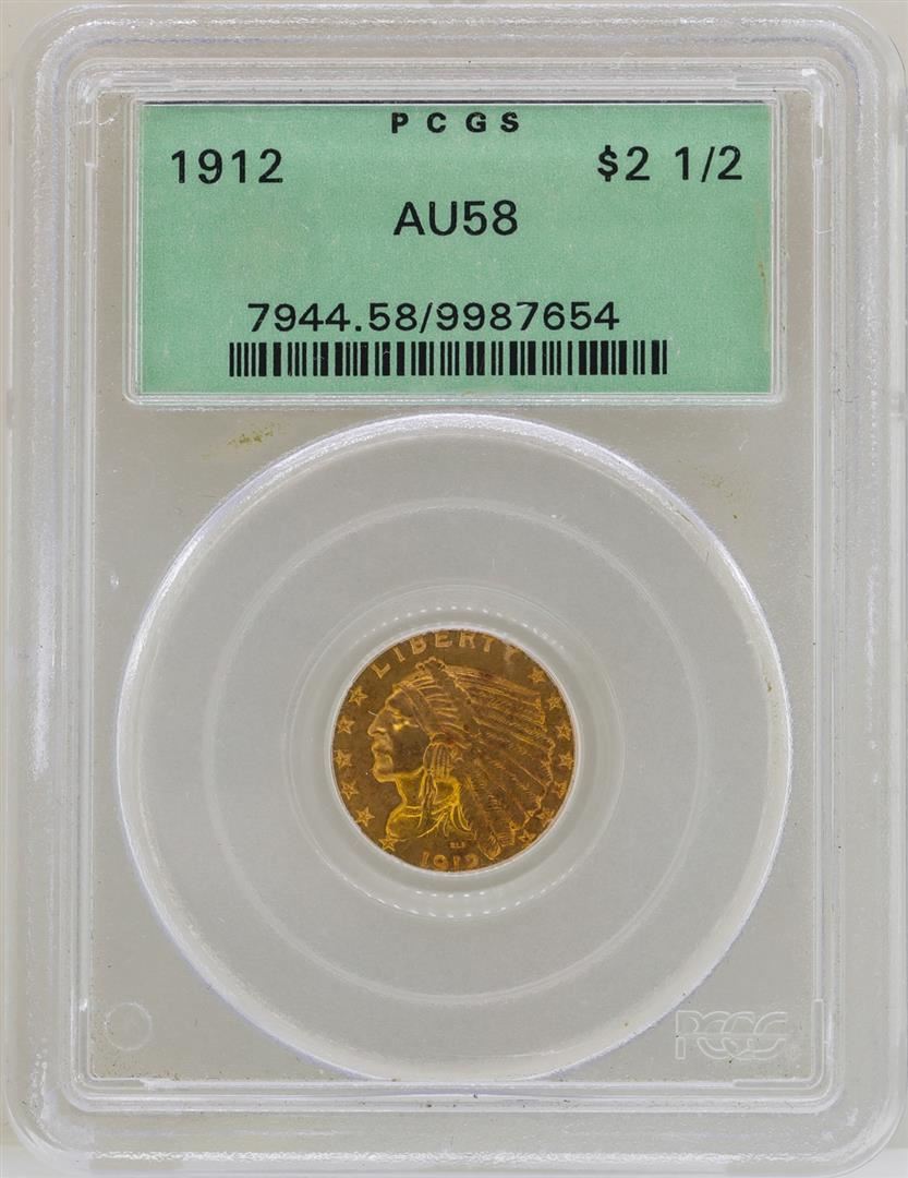 One 1912 $2 1/2 Indian Head Quarter Eagle Gold Coin PCGS AU58. PCGS Graded.